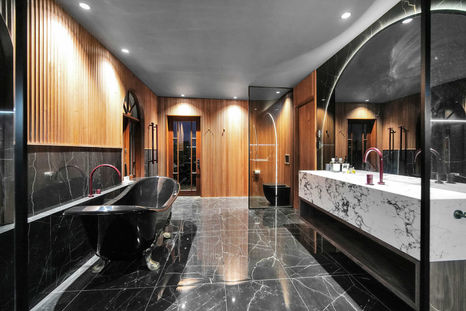 Villa Donini distinguishes itself with a Tuscan flair, reimagined for contemporary living. The lap pool serves as a tranquil oasis, while the tennis court invites active leisure. The home's dark chevron floors and Tasmanian Oak ceilings are a nod to its sophisticated aesthetic, blending seamlessly with the modern luxuries of a renovated masterpiece.